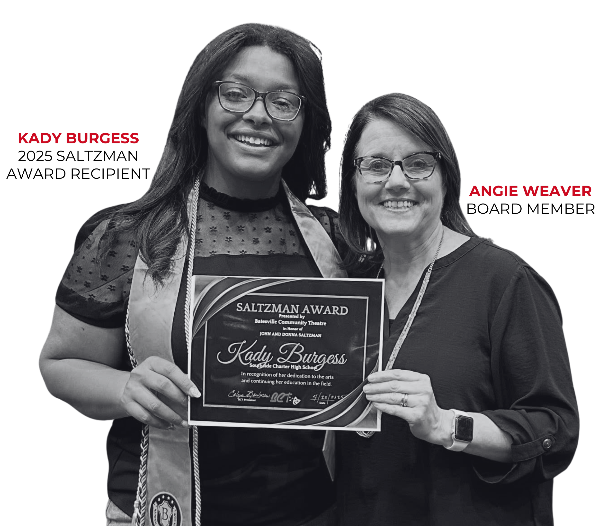 Since 2001, Batesville Community Theatre has proudly supported local students through the John & Donna Saltzman Memorial Scholarship. This scholarship honors John and Donna Wallace Saltzman, lifelong advocates for the arts who dedicated more than twenty years to mentoring students and adults in the Batesville community.